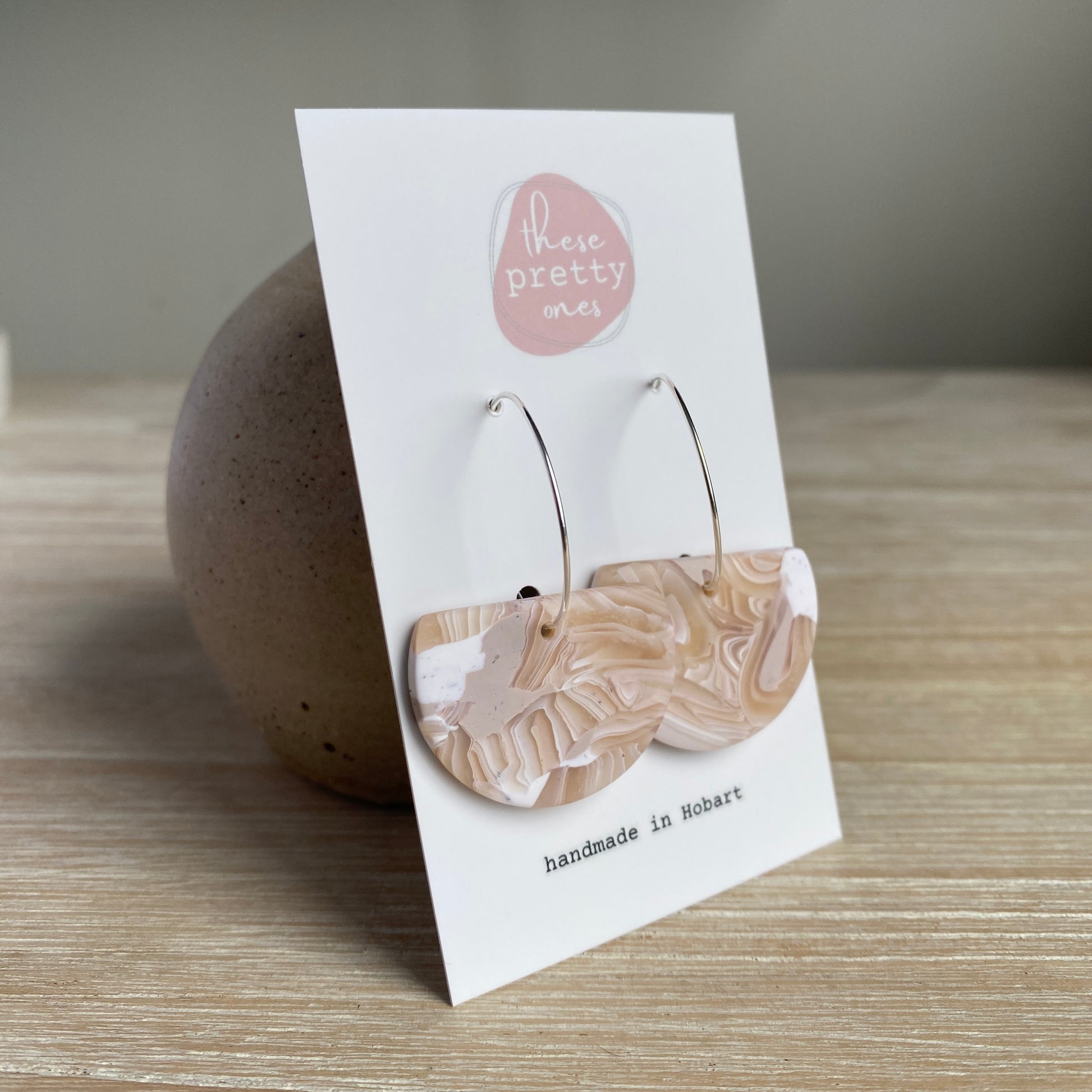 Elevate your style with our 'Oat Marble' Midi Dangles: Ava. Featuring translucent clay that captures sunlight in a stunning way, these hoops add a touch of elegance to any outfit. The neutral tones and intricate organic patterns make for a timeless and versatile accessory.