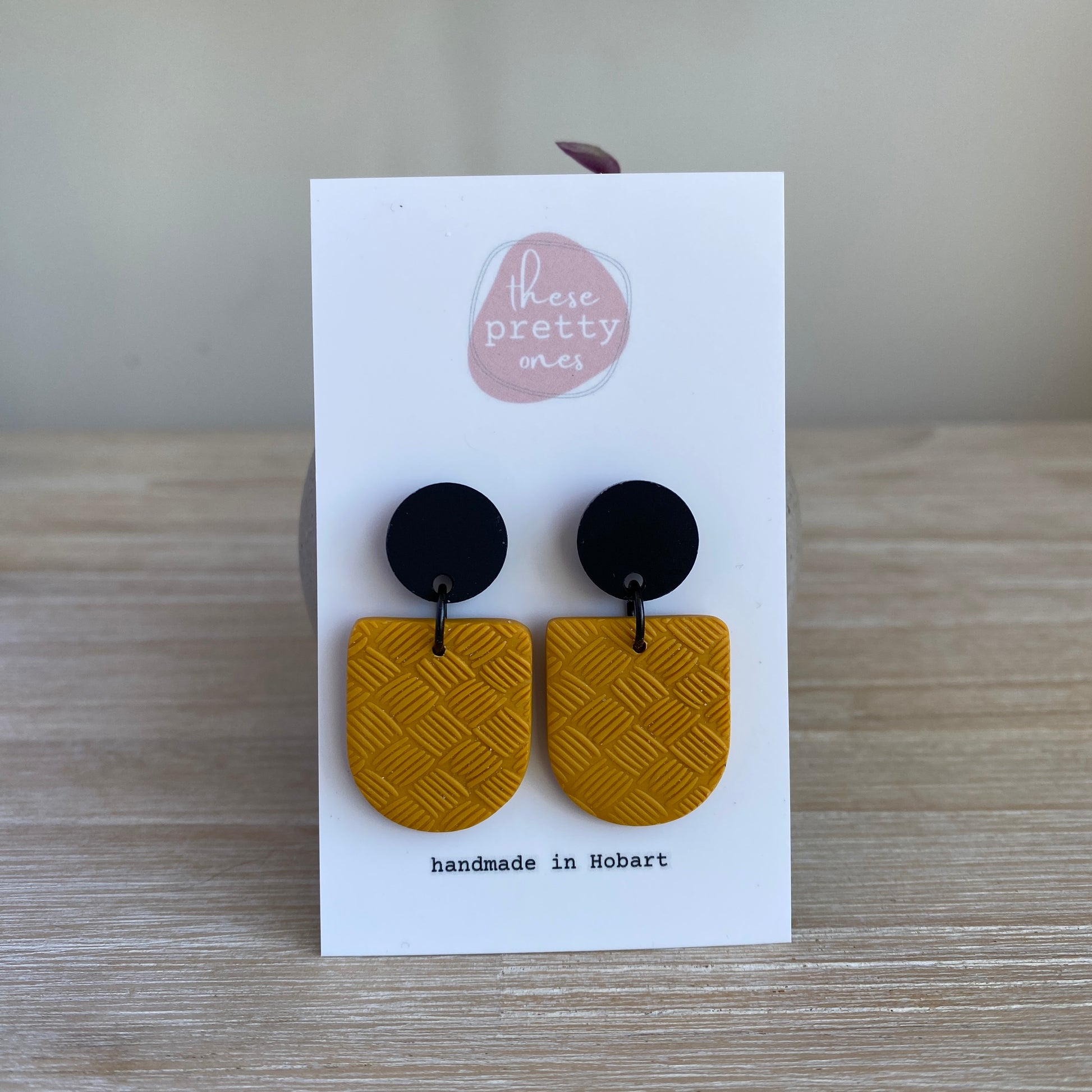 Elevate your outfit with our 'Mustard Muse' Midi Dangles in Lily style! The basket weave texture design adds a unique touch. A perfect gift for any fashion-forward individual.