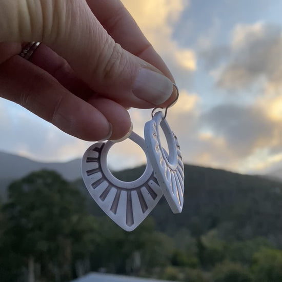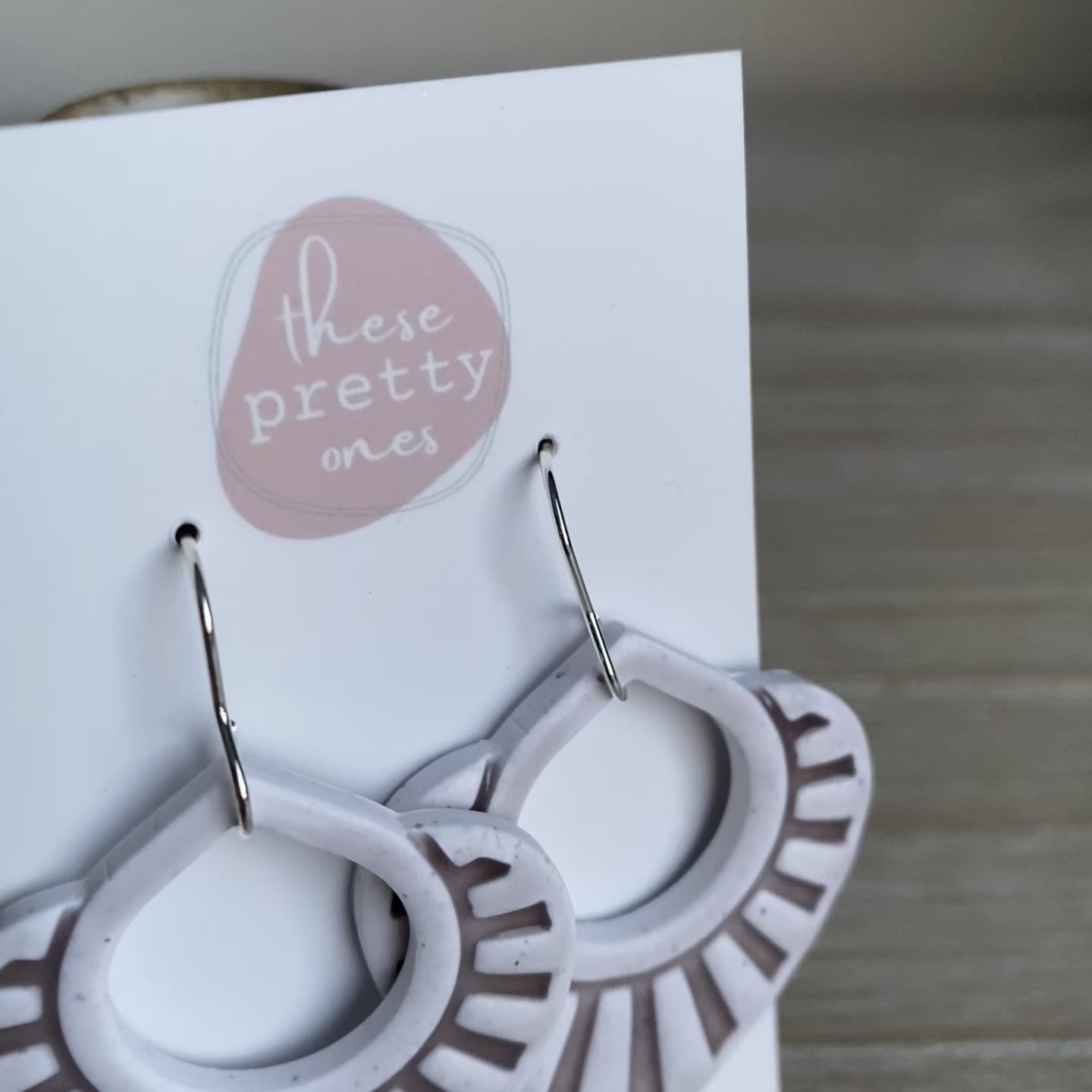 Introducing 'Natalia' Statement Dangles: the perfect accessory to elevate your outfit. These gorgeous statement pieces feature simple hooks and are handcrafted with inlaid latte tones on white granite clay, bringing the sass, style and exuberance of their namesake.