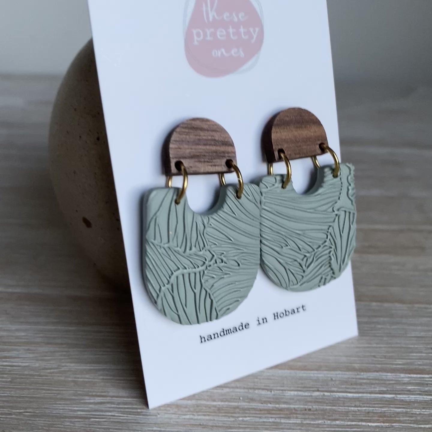 Gorgeous textured dangles in walnut and sage tones. Glam and modern for the stud top lovers.